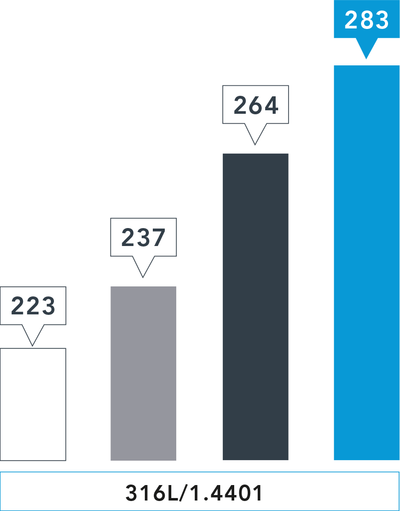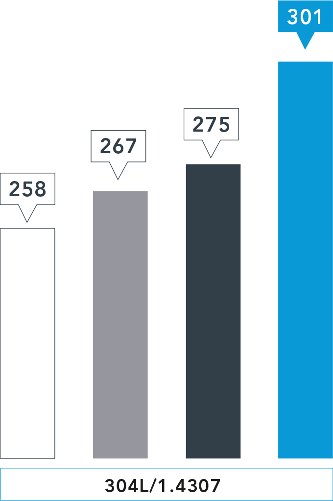 Testing was carried out in November 2025 with Marcegaglia Prodec® and 6 other competing stainless steel bars. Chart excludes Asian material as it underperformed and therefore not seen as comparable. The tool used for the testing was a CNMG cemented carbide insert.